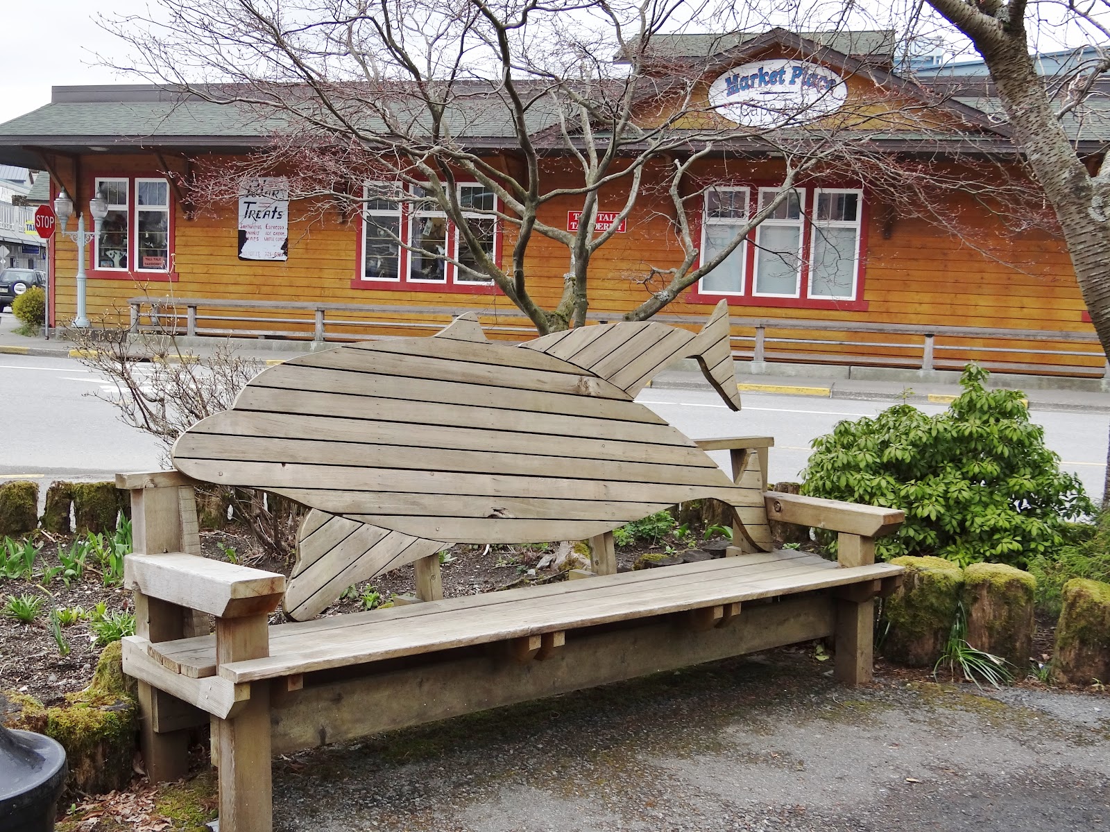 I turned east & walked up Mill St. to the Whale Park. Naming this a park is a slight stretch of the imagination. It’s the size of a postage stamp wedged between a commercial parking lot & a main street. But there is a cute whale theme park bench & the Chief Kyan totem pole.